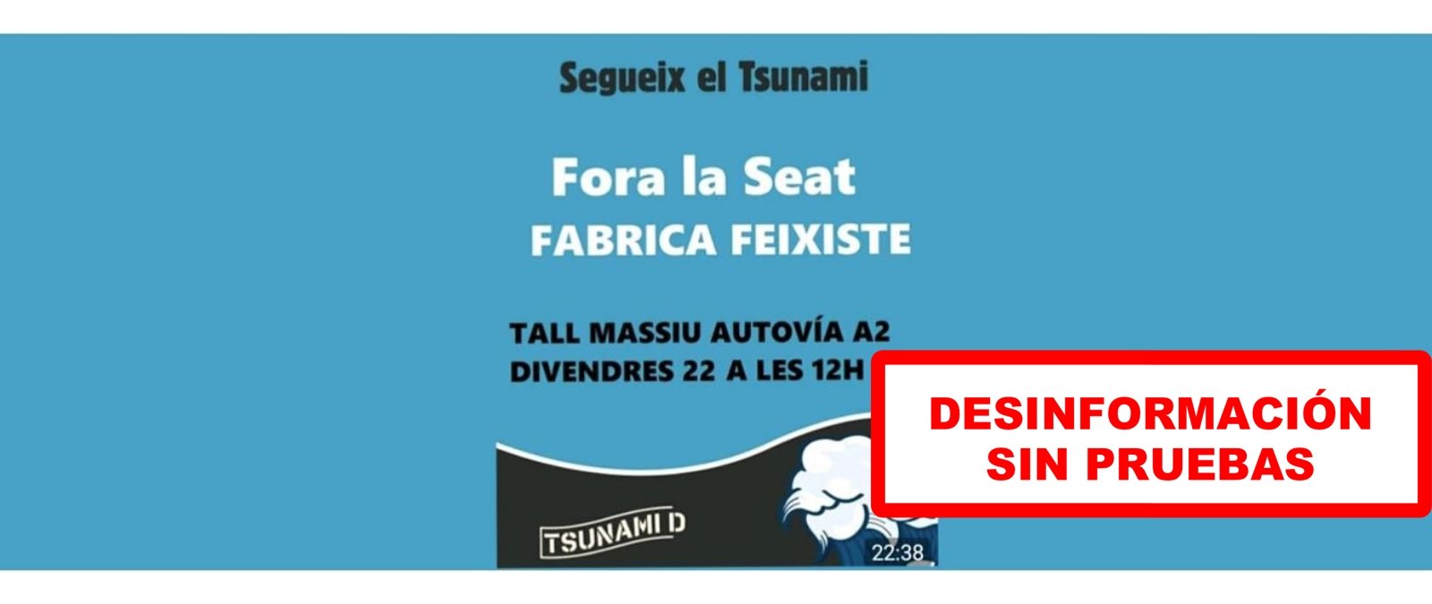 En las últimas horas nos estáis preguntando por una imagen con la estética de Tsunami Democràtic que llama a cortar de forma masiva la autovía A2 el viernes 22 de noviembre a las doce del mediodía con frases como "Fora la Seat" y "Fabrica Feixiste". "Fuera SEAT y Fábrica Fascista". No hay pruebas de que esa imagen sea de Tsunami Democràtic. Os lo explicamos:**