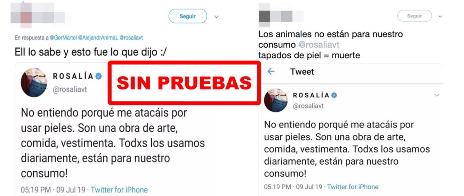 Todo indica que se trata de un tuit falso. En este tuit supuestamente Rosalía dice "No entiendo porqué me atacáis por usar pieles. Son una obra de arte, comida, vestimenta. Todxs los usamos diariamente, están para nuestro consumo". En esta captura del supuesto tuit se ve el 9 de julio como fecha de publicación. Sin embargo, las primeras capturas que aparecen en esta red social son de la noche del 10 de julio, más de un día después. Además, todas las capturas que se difunden son con el mismo número de Likes (2.056) y retuits (1.023) o con este número cortado.