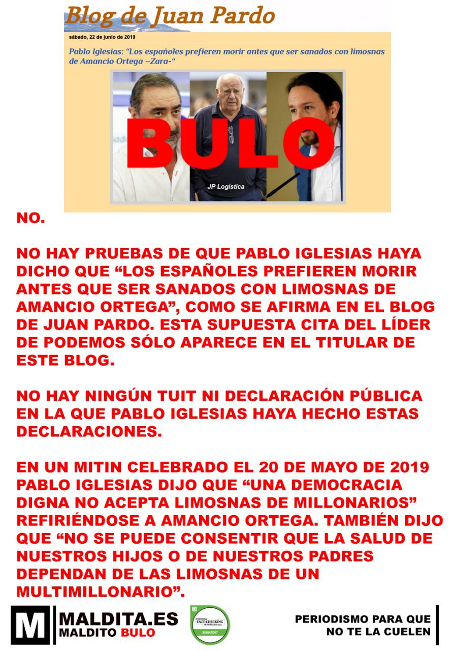Esa supuesta cita del líder de Podemos aparece en un titular del Blog de Juan Pardo. Sólo figura en el titular pero no aparece en el resto del contenido.