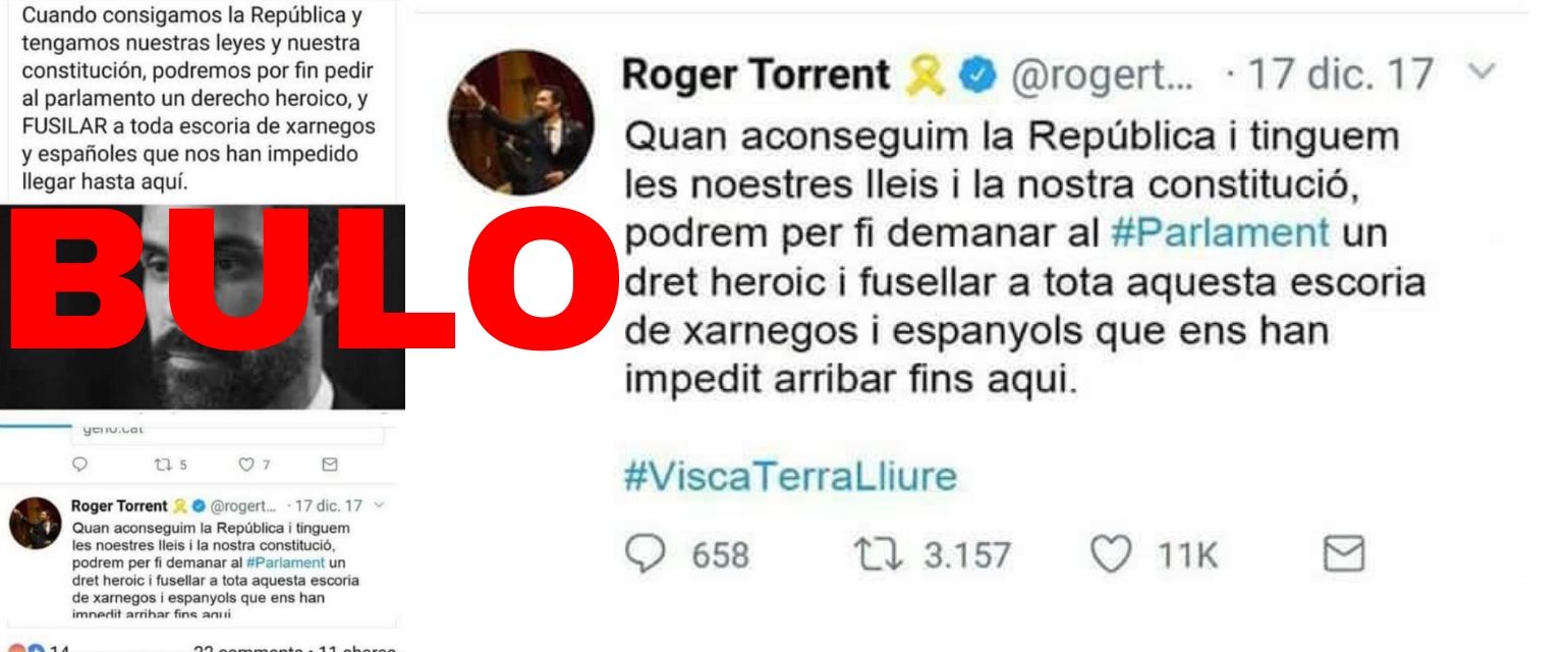 Vuelve a circular en redes sociales un tuit supuestamente publicado por Roger Torrent en el que pide "fusilar a todos los charnegos y españoles" pero es un bulo.