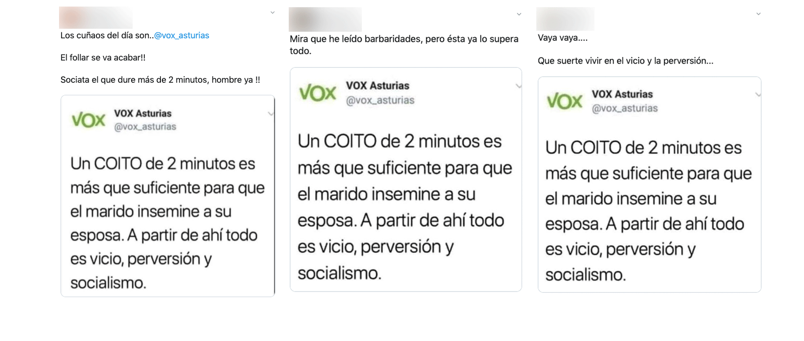Ya lo desmentimos, pero está circulando de nuevo en redes una captura de un supuesto tuit de Vox Asturias en el que se asegura que "un COITO de 2 minutos es más que suficiente para que el marido insemine a su esposa. A partir de ahí todo es vicio, perversión y socialismo". No hay ninguna prueba de que Vox Asturias haya tuiteado esa frase: no está publicada ni archivada y la captura que circula es siempre la misma. Además, Vox Asturias nos desmiente que la hayan publicado.