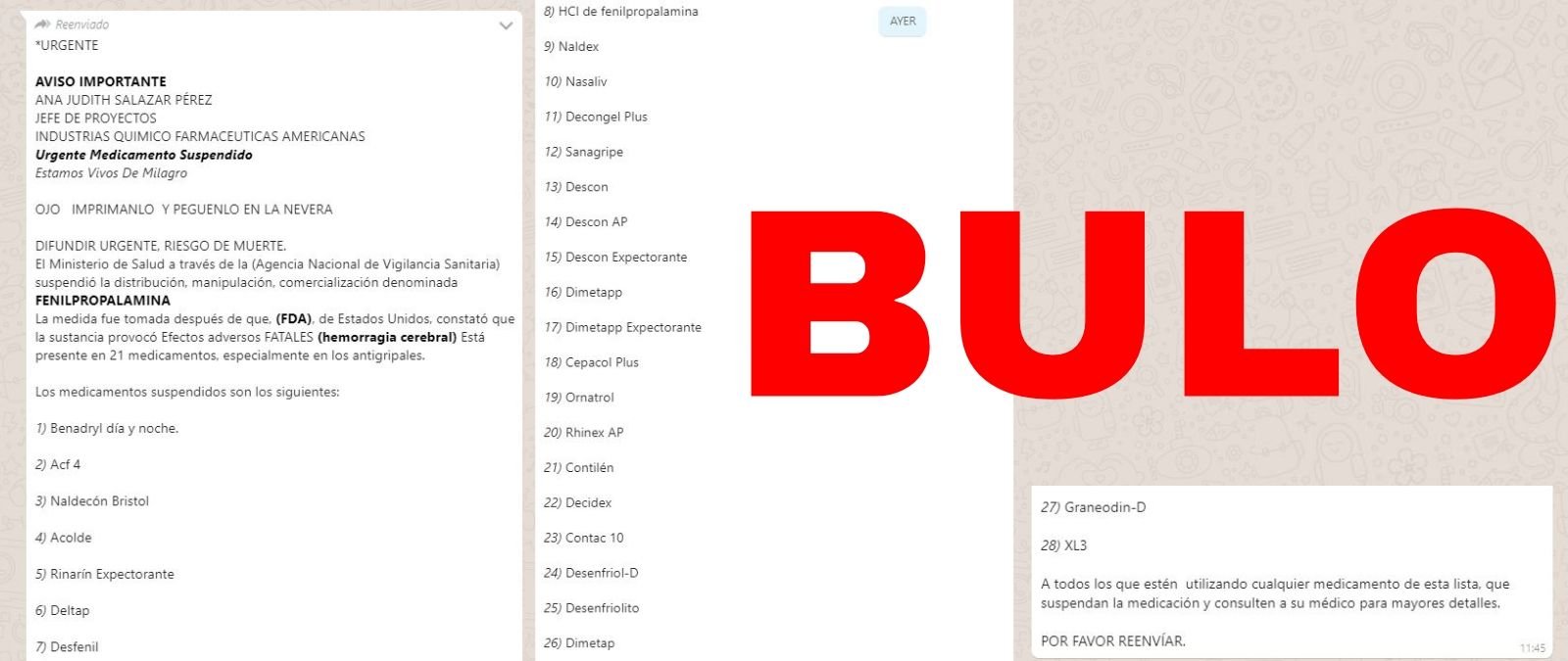 Vuelve a circular una cadena de WhatsApp, esta vez con un encabezado distinto, en el que una supuesta jefe de proyectos de Industrias Químico Farmaceúticas Americanas, Ana Judith Salazar Pérez, lanza una alerta falsa sobre el riesgo de los medicamentos que contenían fenilpropanolamina o "fenilpropalamina" . Sigue siendo un bulo: no hay ninguna alerta sanitaria por los medicamentos que contengan esta sustancia.