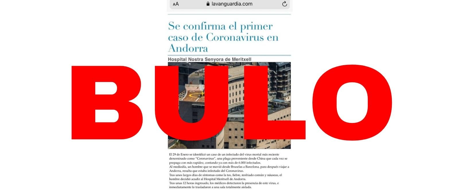 Nos habéis preguntado por una captura de una supuesta noticia de La Vanguardia en la que se asegura que se ha confirmado "el primer caso de Coronavirus en Andorra" el 29 de enero. Es un bulo: La Vanguardia no ha publicado ese contenido y a fecha de 9 de febrero no se ha detectado ningún caso de coronavirus en dicho país. Además, el Gobierno de Andorra ha alertado de "la difusión de noticias falsas" relacionadas con "temas de salud pública".