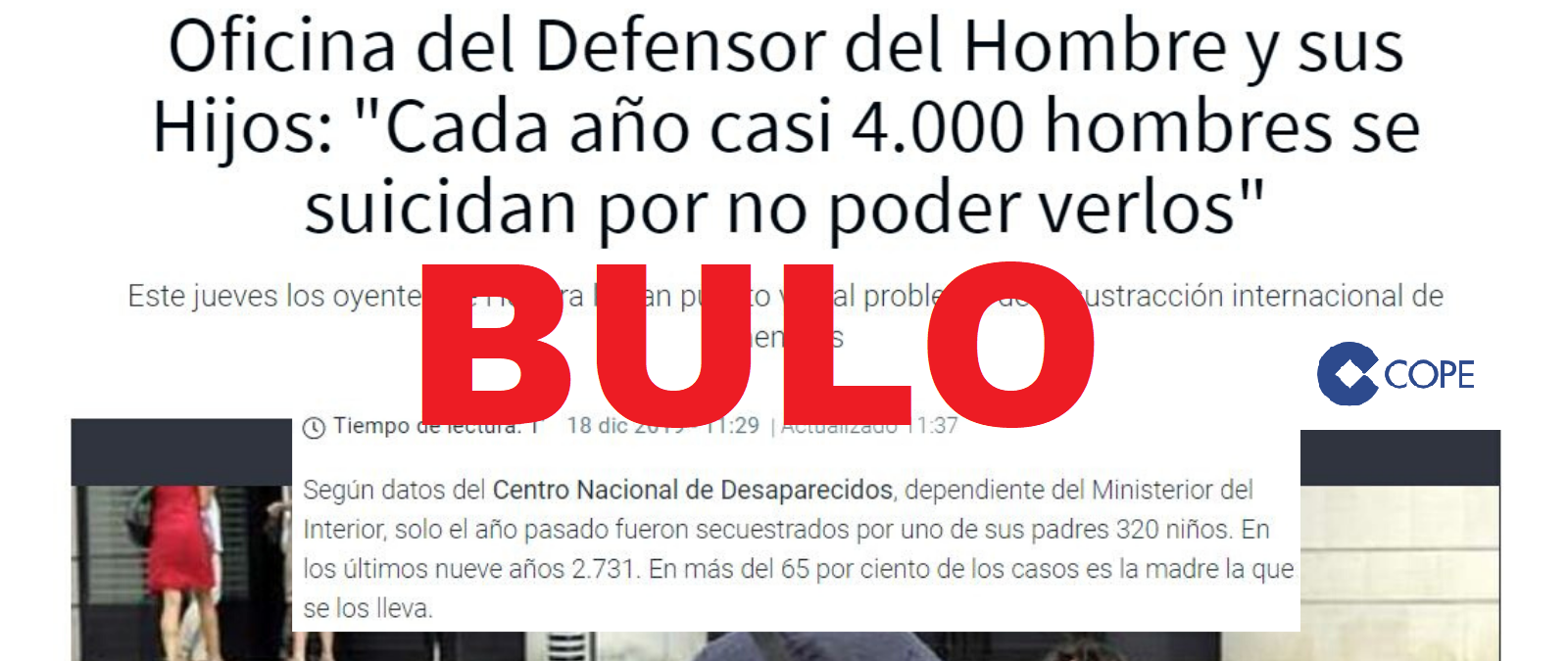 Nos habéis preguntado por un contenido, publicado por COPE, que titula que “cada año casi 4.000 hombres se suicidan por no poder verlos [a sus hijos]” según la asociación privada Oficina del Defensor del Hombre y sus Hijos. Además, en la misma pieza se dice que, “según datos del Centro Nacional de Desaparecidos, (...) en más del 65 por ciento de los casos [de secuestros de niños] es la madre la que se los lleva”. No es cierto que se suiciden "casi 4.000 hombres" cada año ni hay datos que sostengan que en el 65% de los secuestros de niños "es la madre la que se los lleva". Os lo explicamos:
