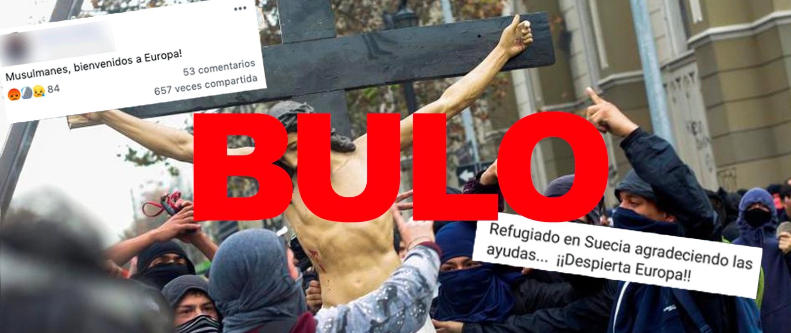 En julio de 2018 circularon unas imágenes de un grupo de jóvenes encapuchados destrozando la figura de un Cristo con mensajes que afirmaban que eran refugiados en Suecia, pero tal y como desmentimos en Maldita.es se trataba de una marcha de estudiantes en Chile en 2016.