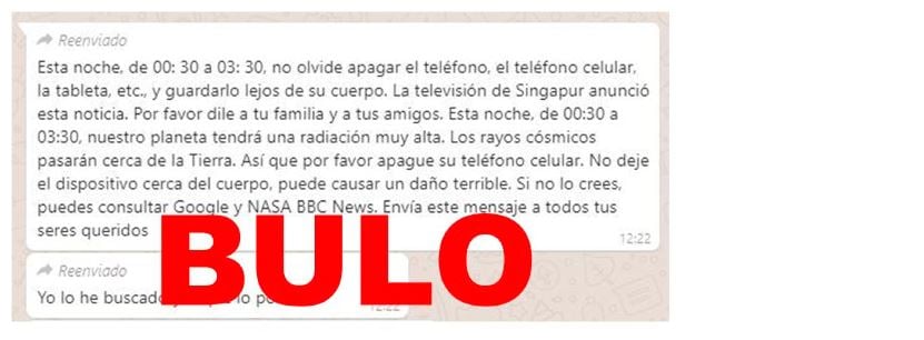 Nos estáis preguntado por un mensaje que circula en redes sociales que dice que "esta noche, de 00:30 a 03:30 no olvide apagar el teléfono móvil" porque "nuestro planeta tendrá una radiación muy alta" como consecuencia de que "los rayos cósmicos pasarán cerca de la tierra". Es un bulo que vuelve. No tienes que apagar tu móvil por la radiación procedente del espacio porque no se ha demostrado que los rayos cósmicos puedan afectar a los móviles de forma que nos hagan "un daño terrible".