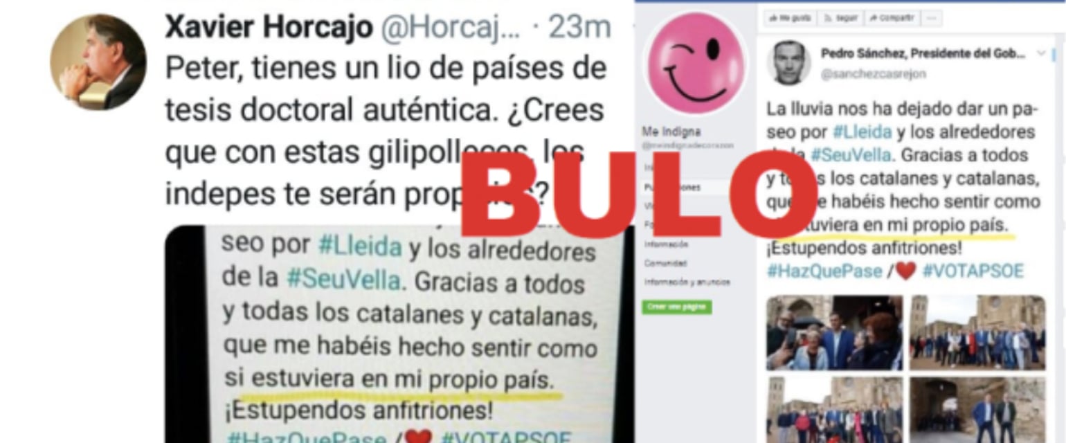 A principios de este año se hizo viral un tuit en el que supuestamente Pedro Sánchez daba las gracias a los catalanes por haberle "hecho sentir como si estuviera en mi propio país" tras su viaje a Lleida. Como ya os contamos entonces, es un bulo: se trata de un tuit de la cuenta "@sanchezcasrejon", que se autodenomina satírica. Ahora este bulo vuelve.