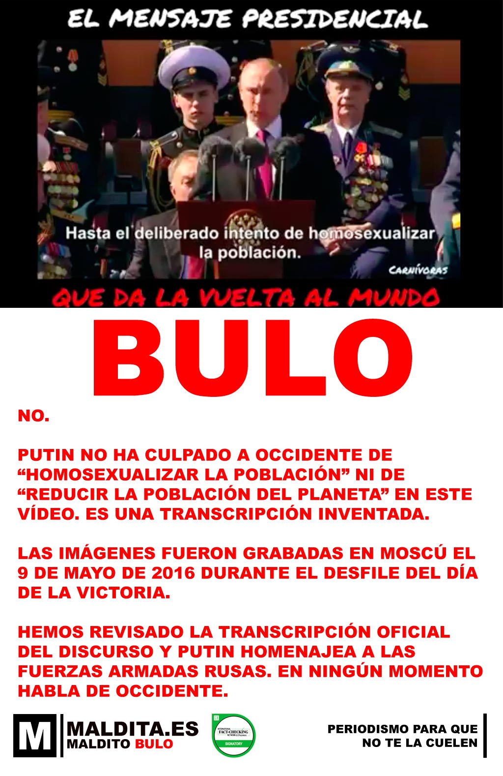 Hemos revisado la transcripción oficial del discurso y Putin homenajea a las fuerzas armadas rusas. En ningún momento habla de Occidente.