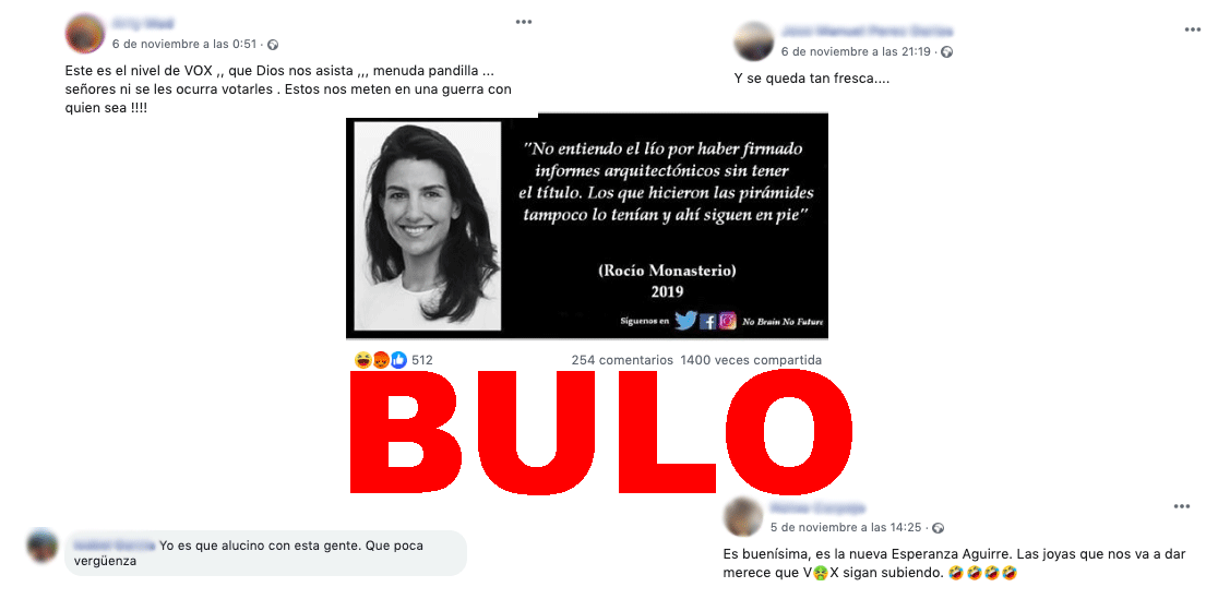 Se está moviendo una supuesta frase atribuida a la presidenta de Vox en Madrid, Rocío Monasterio, en la que se dice: "no entiendo el lío por haber firmado informes arquitectónicos sin tener el título. Los que hicieron las pirámides tampoco lo tenían y ahí siguen en pie". La frase se ha viralizado como si fuera real, pero es un bulo.