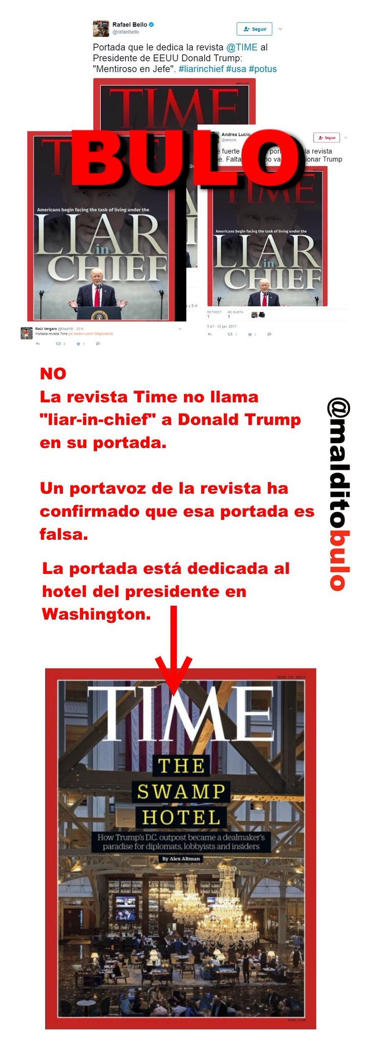 No, la revista Time no ha llamado "liar-in-chief" (mentiroso a cargo) a Donald Trump en su portada. Es un montaje que se ha viralizado.