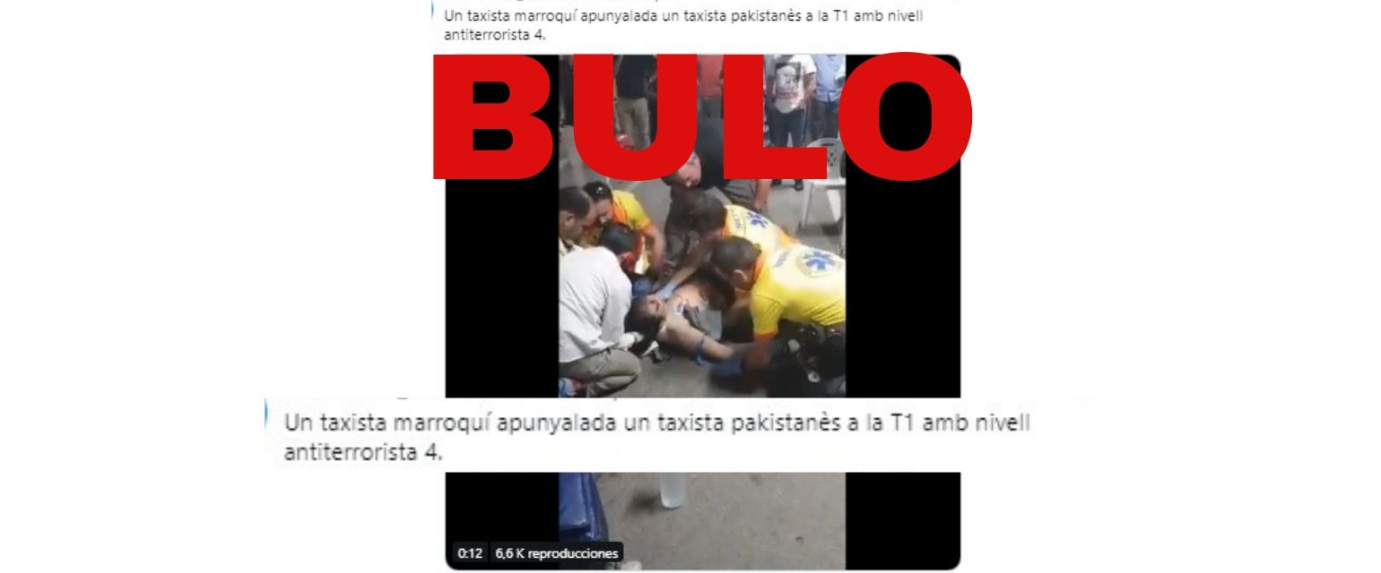 Nos habéis hecho llegar unas imágenes con un texto que asegura que "un taxista marroquí ha apuñalado a un taxista pakistaní en la Terminal 1" en referencia al aeropuerto de Barcelona ("Un taxista marroquí apunyalada un taxista pakistanès a la T1 amb nivell antiterrorista 4"). Esto es un bulo.