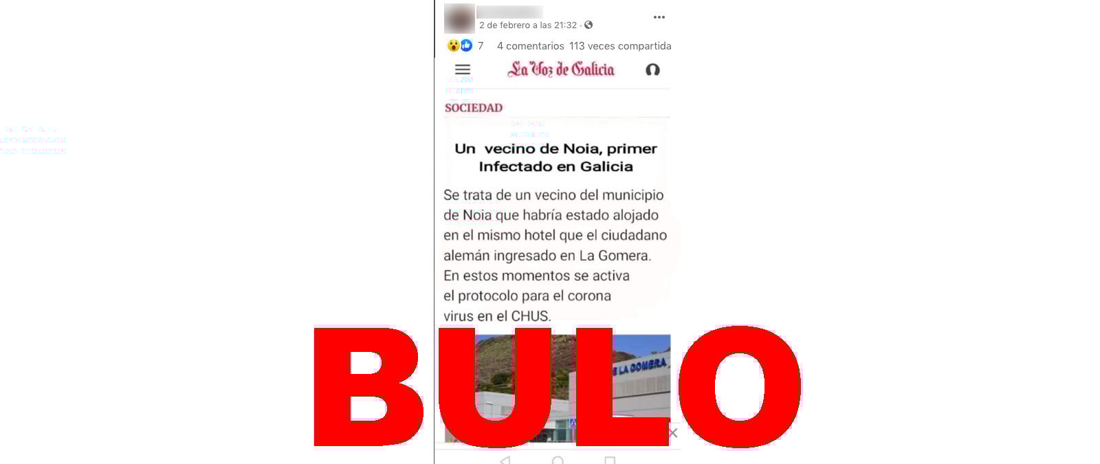 Está circulando una captura de un supuesto artículo de La Voz de Galicia titulado "un vecino de Noia, primer infectado en Galicia" por coronavirus, después de que hubiera estado "alojado en el mismo hotel que el ciudadano alemán ingresado en La Gomera". Es un bulo: La Voz de Galicia no ha publicado dicho artículo y a fecha de 10 de febrero no se ha detectado ningún caso de coronavirus ni en Noia ni en Galicia.