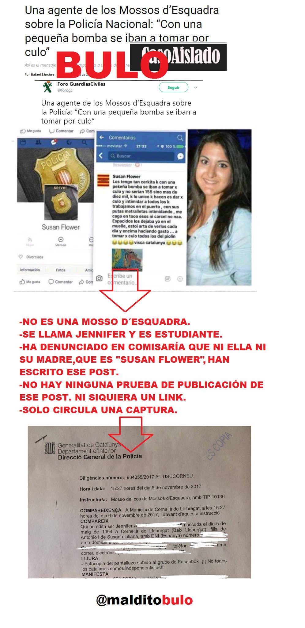 La protagonista del bulo no es una Mosso d'Esquadra. Se llama Jennifer, es estudiante y ha denunciado en comisaría que ni ella ni su madre (que es "Susan Flower") han escrito ese post.