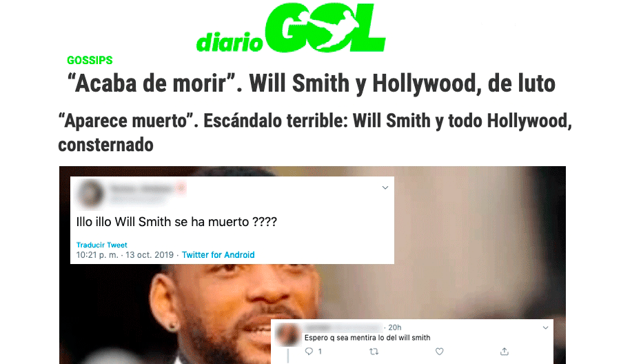 Ya en septiembre publicaron otro contenido titulado " 'Aparece muerto'. Escándalo terrible: Will Smith y todo Hollywood, consternado", mientras que en el contenido hablaban sobre la muerte de un hombre que acusó de asalto sexual al actor Kevin Spacey. El artículo no tiene nada que ver con Smith y sólo lo vuelven a mencionar cuando dicen que es compañero de profesión de Spacey.