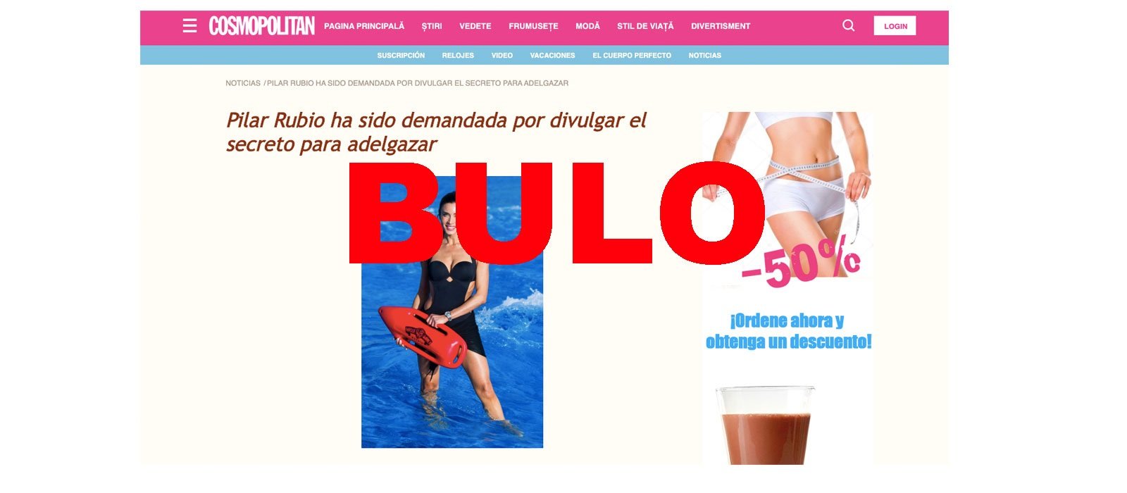 Está circulando un contenido titulado "Pilar Rubio ha sido demandada por divulgar el secreto para adelgazar" que imita el diseño de la revista Cosmopolitan y en el que la presentadora recomienda supuestamente el consumo de un batido llamado Chocolate Slim para adelgazar. Se trata de un timo: no es un contenido real de dicho medio y la presentadora no ha hecho esa recomendación.