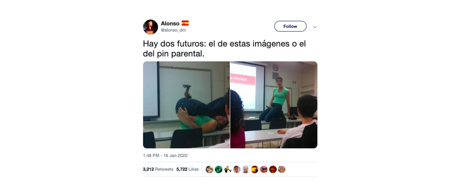 Coincidiendo con el debate sobre el llamado "pin parental", se han empezado a viralizar unas imágenes de una mujer realizando varias posturas sexuales en una clase, que se mueven con el siguiente texto: "Hay dos futuros: el de estas imágenes o el del pin parental". Las fotos que se relacionan con ese "pin parental" no son ni de una escuela ni fueron tomadas en España: corresponden a un curso impartido en una universidad de Canadá.