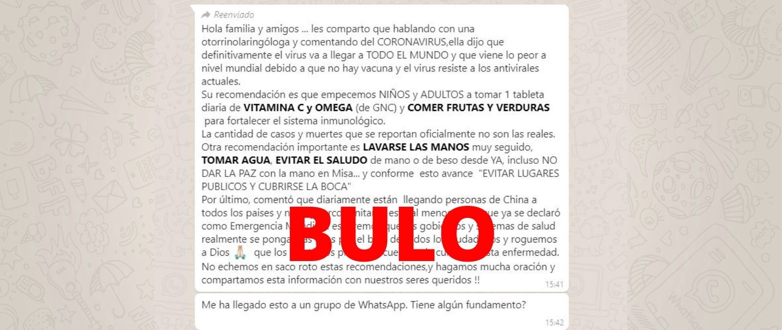 Nos estáis preguntando mucho por una cadena de WhatsApp que afirma que "una otorrinolaringóloga" ha recomendado tomar "1 tableta de vitamina C y omega" de la marca GNC "para fortalecer el sistema inmunológico" para hacer frente al brote del nuevo coronavirus (Covid-19). En este mensaje también se recomienda "comer fruta y verdura". Sin embargo, como os hemos contado en Maldita Ciencia, ningún alimento previene de la infección por coronavirus.