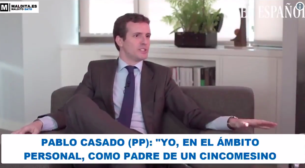El Presidente del PP, Pablo Casado, ha afirmado en una entrevista en El Español que en España la ley de plazos permite el aborto libre hasta el quinto mes. Refiriéndose a su hijo, que nació con 25 semanas, ha dicho que "yo, en el ámbito personal, como padre de un cincomesino, con un inicio de parto, amenaza de parto en un tramo legal para abortar libremente según la nueva ley de plazos [...]"