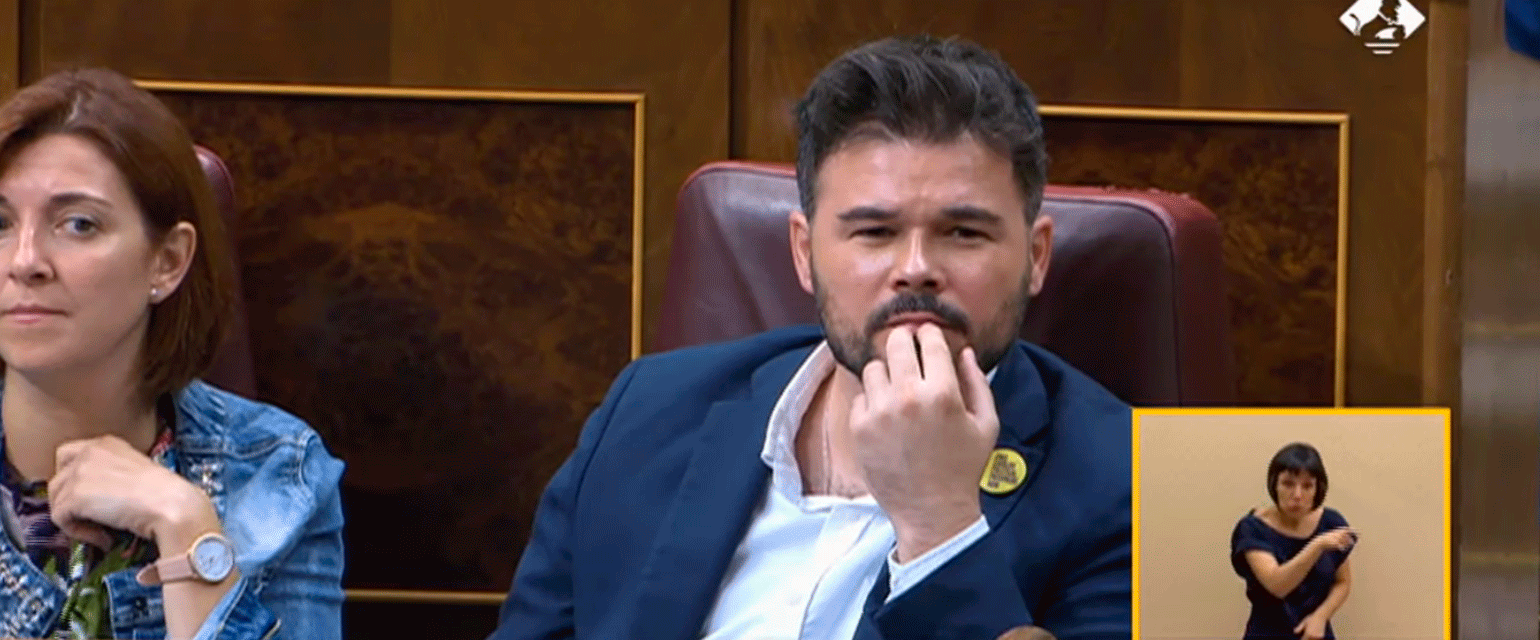 Gabriel Rufián ha dicho en el debate de investidura de Pedro Sánchez que tiene “el honor de compartir grupo parlamentario con un diputado que hasta hace muy poco estuvo ahí, Gerard Gómez del Moral, y que negoció esa mesa de diálogo. ¿Sabe que me ha dicho? Que no van. Que no van, pero que no va ni el PP, que no va ni Ciudadanos y que a veces ustedes tampoco. Que a veces nos quedamos nosotros solos ahí".