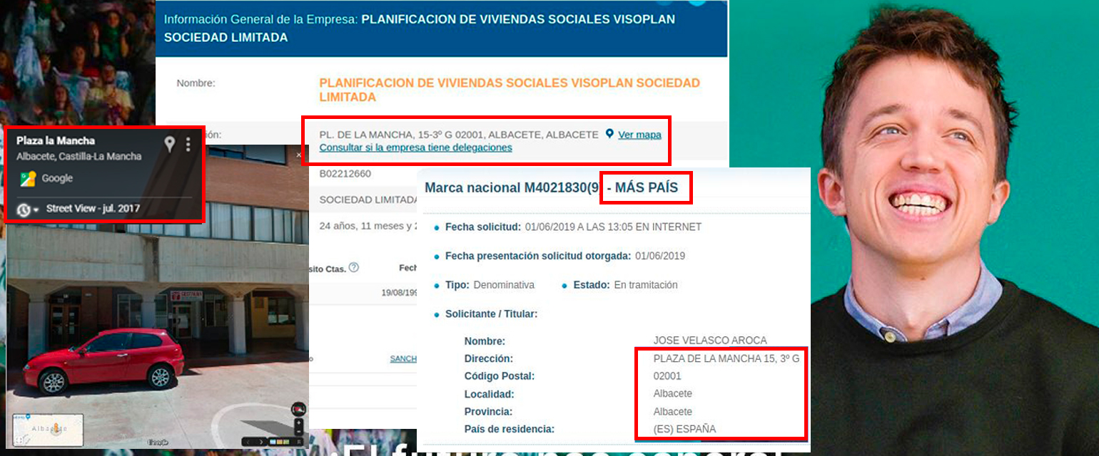 La marca Más País fue registrada por José Velasco, tres días después de la compra de la web, en una dirección de Albacete que, además, corresponde con la sede de una empresa de Sánchez Ródenas: en la plaza de La Mancha, número 15, 3º G, de Albacete.