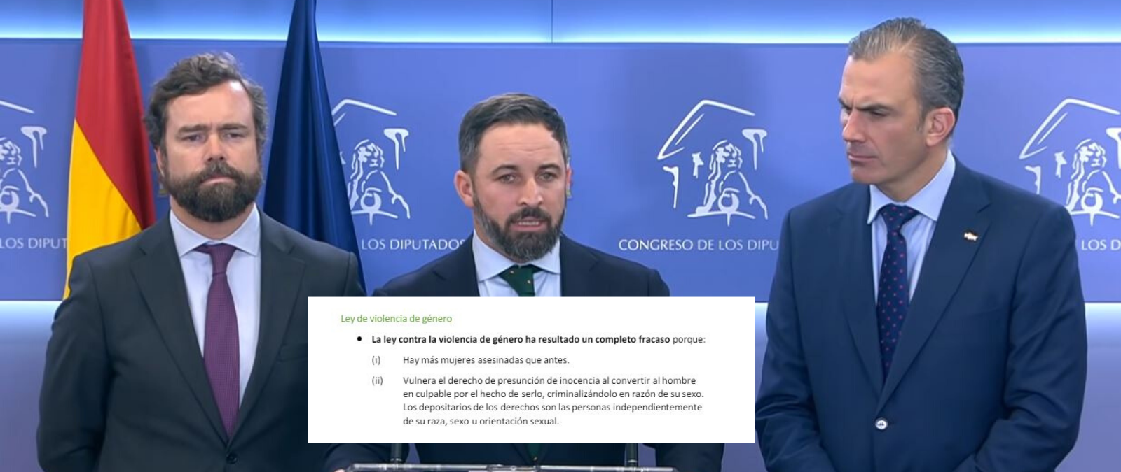 Entre las razones que da en el documento, Vox asegura que la Ley Integral contra la Violencia de Género "ha resultado un completo fracaso porque hay más mujeres asesinadas que antes". Un argumento que, además, han repetido a través de sus redes sociales.