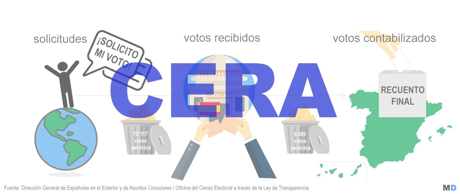 Los votos CERA se envían desde las delegaciones consulares de España en los países en los que residen los votantes y son contabilizados en el recuento final de las Juntas Electorales Provinciales tres días después de las elecciones pero en algunos casos no llegaron a tiempo o directamente no llegaron.
