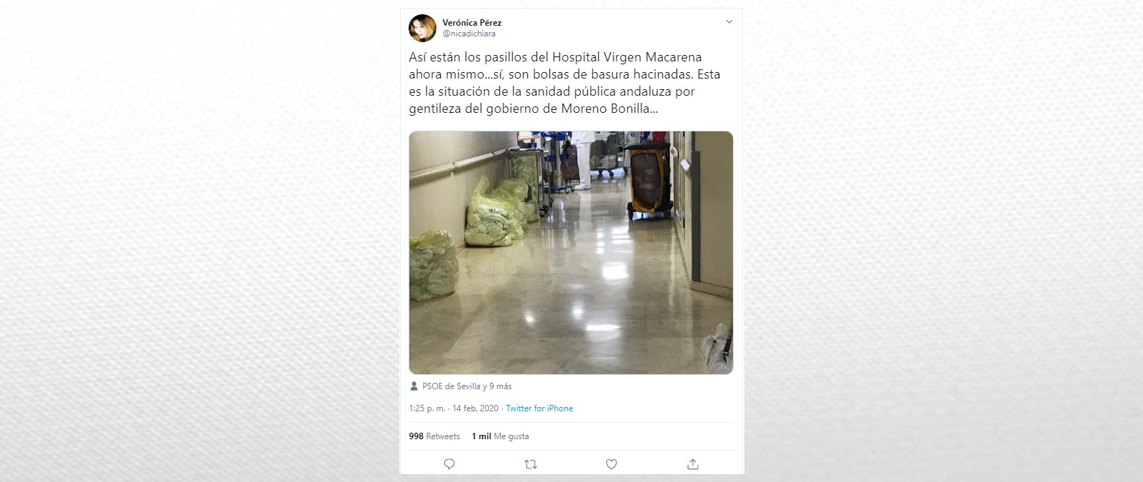 Verónica Pérez, secretaria general del PSOE de Sevilla y diputada por Sevilla en el parlamento andaluz, ha tuiteado una foto de los “pasillos del Hospital Virgen Macarena ahora mismo” acompañándola de un texto en el que dice que lo que se ve son “bolsas de basura hacinadas”.