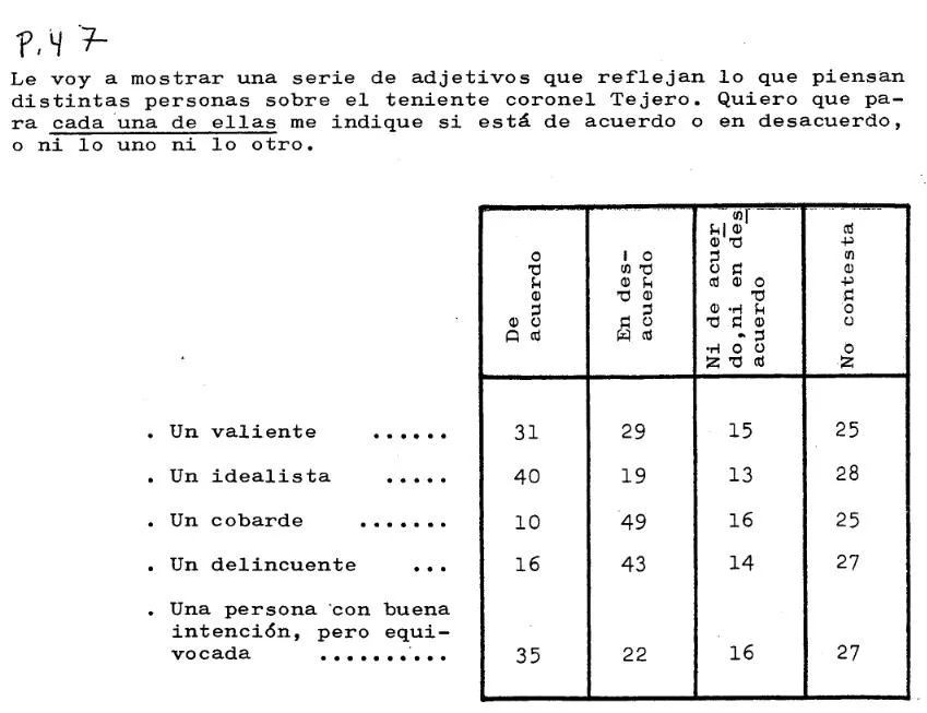 Aunque después del 23-F el CIS recogía muy buenos datos en el apoyo y la confianza en la democracia, esto no se tradujo en una condena o repulsa por parte de los encuestados a la figura de Antonio Tejero.