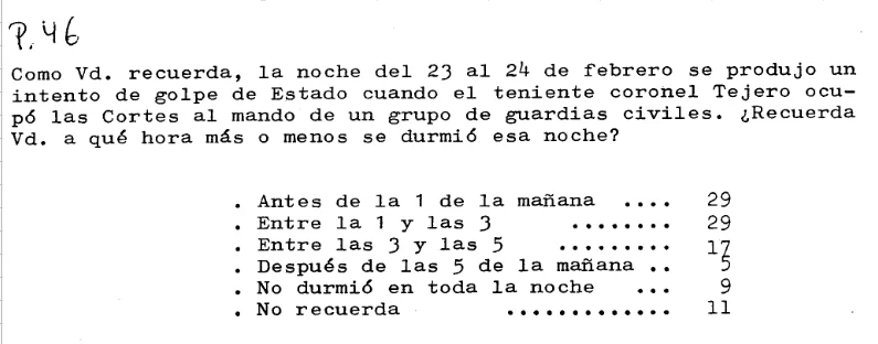 Se hicieron dos preguntas sobre el tema: a qué hora se durmieron los españoles ese día y, la citada anteriormente, sobre si estaban de acuerdo con alguno de los adjetivos que el encuestador decía para definir a Tejero. Con respecto a la de la hora, más de la mitad de los encuestados (51%) se durmió después de la 1 de la madrugada y sólo el 29% lo hicieron antes de esa hora. Incluso un 9% de los españoles declaró no haber dormido nada.