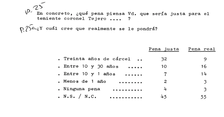 También se preguntó por cuál debería ser la pena para Antonio Tejero en febrero de 1982, un año después y cuando comenzó el juicio por el intento del golpe de Estado. Casi un tercio de los encuestados pensaban que sería justa una pena de 30 años de cárcel, pero pensaban que se le impondría una menor.