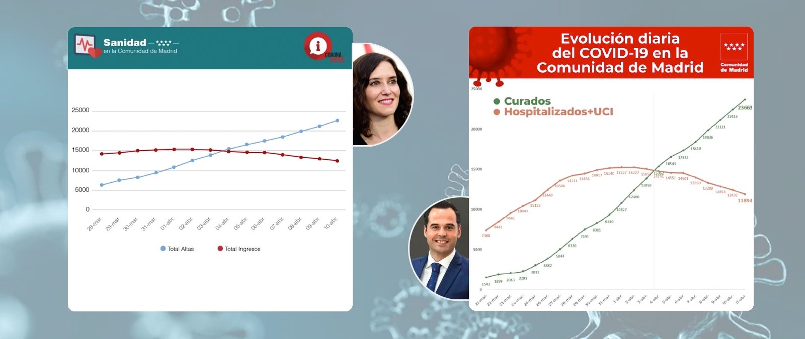 Tanto la presidenta de la Comunidad de Madrid, Isabel Díaz Ayuso, como el vicepresidente, Ignacio Aguado, han publicado en Twitter sendos gráficos en los que comparan datos acumulados (las altas hospitalarias por coronavirus) con datos diarios (ingresos o hospitalizados+UCI). Ambas gráficas dan la sensación óptica de que las altas superan en mucho al número de ingresos o de hospitalizados, pero no es así.