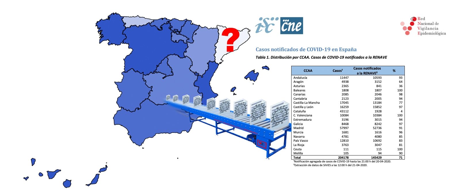 La Generalitat de Cataluña no ha entregado información completa sobre el 95,53% de los casos de coronavirus detectados en su territorio al Centro Nacional de Epidemiología (CNE), según el último informe sobre la situación de COVID-19 en España que publica el Instituto de Salud Carlos III. Este porcentaje se calcula sobre el total de casos agregados que sí está enviando Cataluña al Centro de Coordinación de Alertas y Emergencias (CCAES) del Ministerio de Sanidad. El Gobierno catalán es el que menos está cumpliendo con la notificación de la información de los casos de coronavirus al Sistema de Vigilancia en España (SiViES) que gestiona el CNE, dependiente del Instituto de Salud Carlos III (ISCIII).