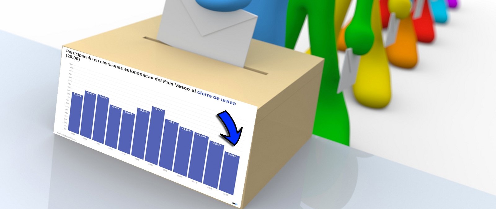 Las elecciones autonómicas en el País Vasco de este domingo 12 de julio en el País Vasco han acabado con la participación más baja de la historia: un 52,86%. El mínimo anterior se dio en 1994, cuando se registró un 59,69% de participación. Este 12-J, durante la pandemia por el coronavirus, se han registrado casi siete puntos menos, mientras que en Galicia, en cambio, la participación ha crecido más de cinco puntos.