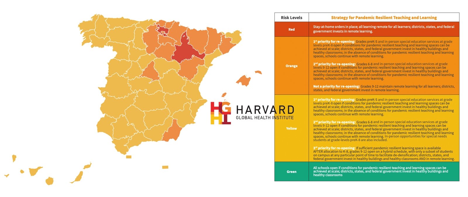 En Estados Unidos, por ejemplo, sí se ha planteado que la vuelta a las aulas esté condicionada a los indicadores epidemiológicos. El 20 de julio, el Harvard Global Health Institute - HGHI (Instituto de Salud Global de Harvard), un instituto asociado a la Universidad de Harvard, publicó un informe en el que establecía unos niveles de riesgo para la educación presencial basado en la incidencia diaria de casos de COVID-19 en zonas determinadas.