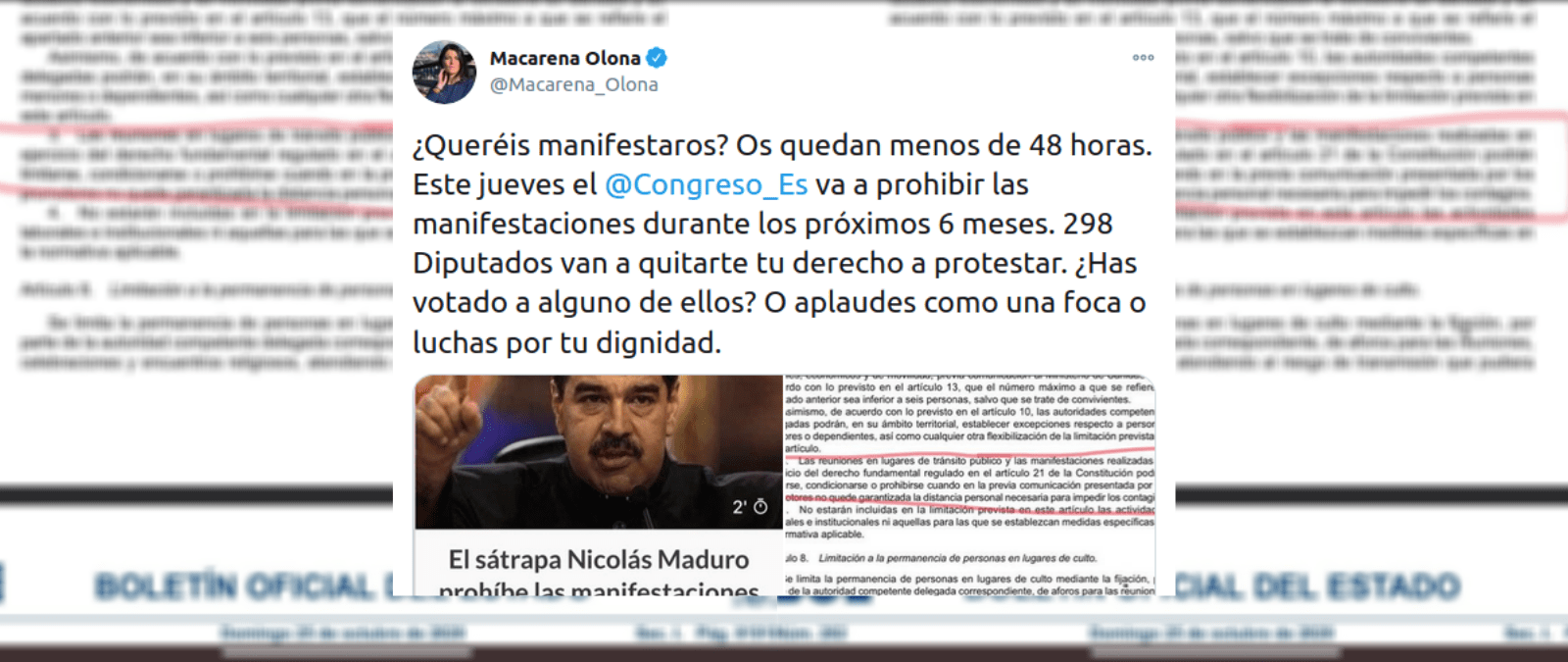 Por lo tanto, es falso que el Congreso vaya a “prohibir las manifestaciones durante los próximos 6 meses” como dice Macarena Olona.