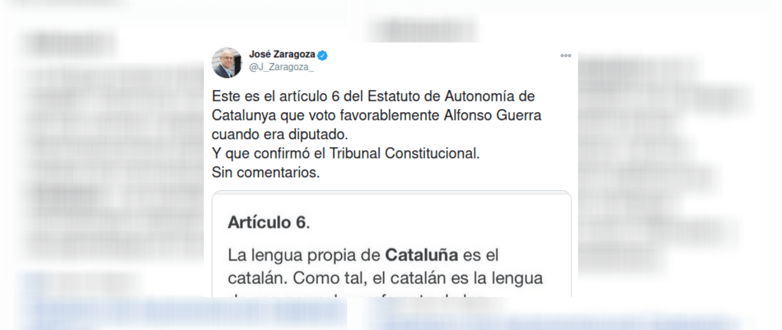 El Tribunal Constitucional (TC) no confirmó el artículo 6 del 'Estatut' tal y como lo ha adjuntado en su tuit José Zaragoza. Cuatro años después de su aprobación en el Congreso, el TC declaró en la sentencia 31/2010, inconstitucionales, y por tanto, nulos, determinados aspectos de 14 artículos del Estatuto. Entre ellos, uno del artículo 6 que hace referencia al catalán como lengua "preferente" y que aparece en la imagen del tuit.
