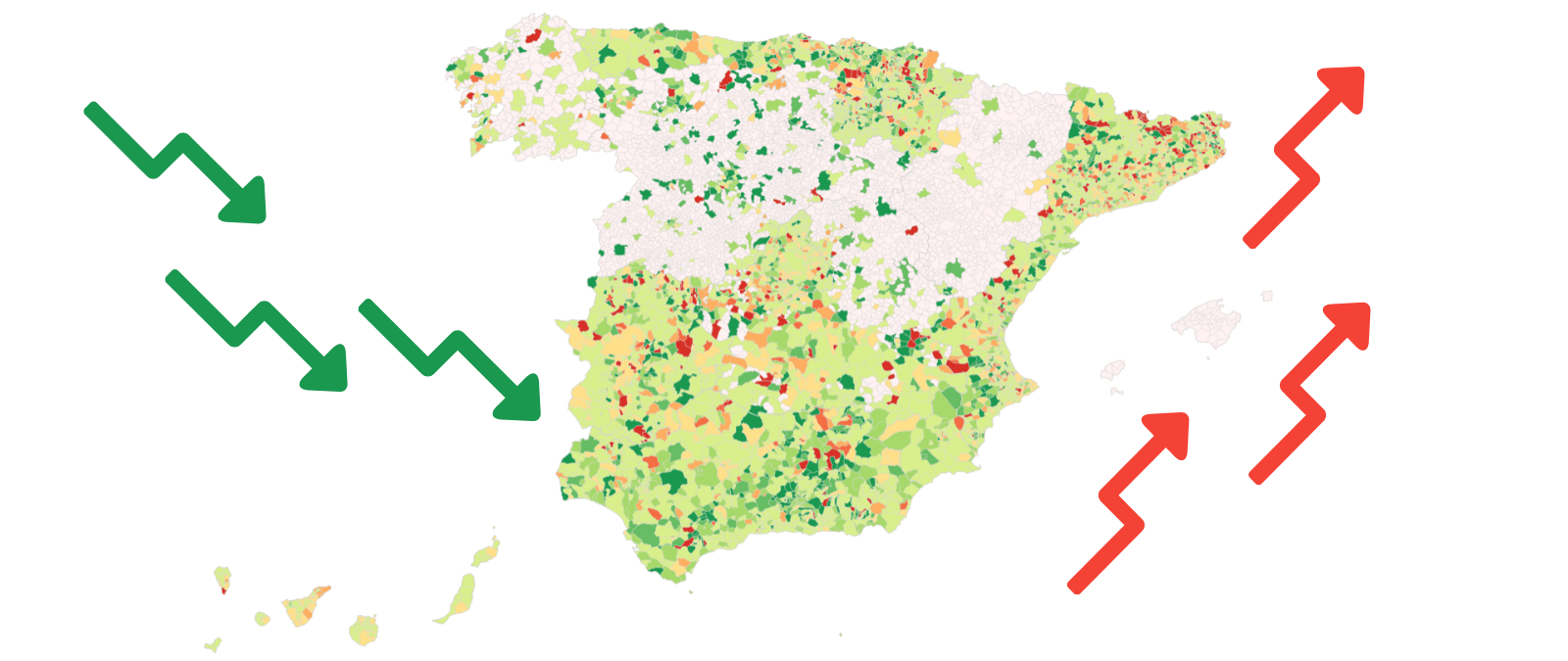 Para hacer el cálculo de la evolución de la incidencia hemos restado la incidencia actual menos la antigua. Para colorear esta evolución en los gráficos hemos utilizado tramos de 100 puntos: