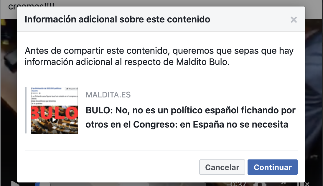 Sin embargo, la alianza con Meta nos permite no sólo verificar independientemente el contenido falso: las plataformas alertan a los usuarios que han compartido un bulo cuando Maldita.es lo desmiente y además dice reducir la circulación de aquello que nosotros señalamos como falso. Esto nos permite tener más impacto y llegar a más gente que puede estar tragándose las mentiras.