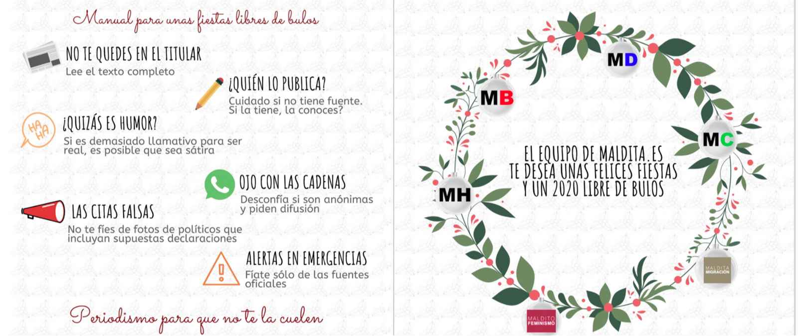 En estas Navidades, desde Maldita.es queremos desearte unas fiestas y un 2019 libre de bulos con nuestra felicitación navideña. Descárgala, imprímela y regálala a tu familiares, amigos, conocidos... Incluye un manual para que no te la cuelen estas fiestas y hemos dejado la parte de dentro libre para que puedas personalizarla.