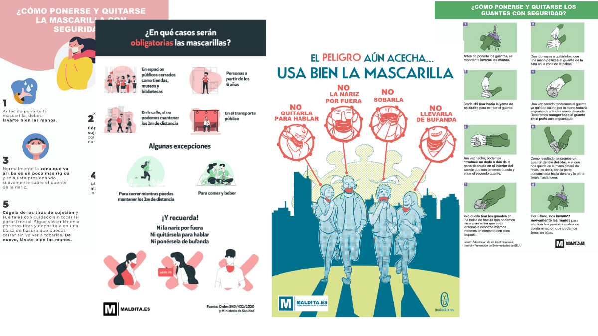 Este primer paquete de ilustraciones incluye tutoriales sobre cómo quitarse los guantes y cómo utilizar las mascarillas. Además también incluimos la cartela que has visto anunciada por las calles de 55 municipios de España.