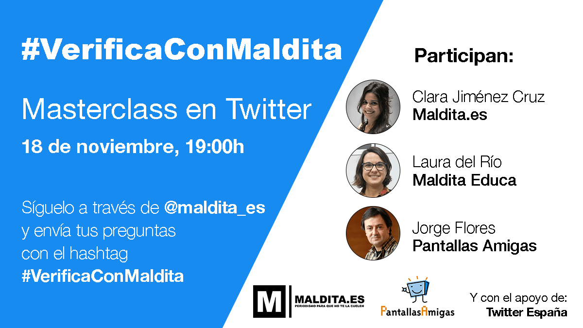 El próximo miércoles 18 de noviembre, a las 19:00 h, Clara Jiménez Cruz y Laura del Río, de Maldita.es, estarán junto a Jorge Flores, de PantallasAmigas, en directo en Twitter desde nuestra cuenta, @maldita_Es impartiendo una MasterClass de Lucha Contra los Bulos y en favor del Pensamiento Crítico. Además podrás plantear tus preguntas en el hashtag #VerificaConMaldita.