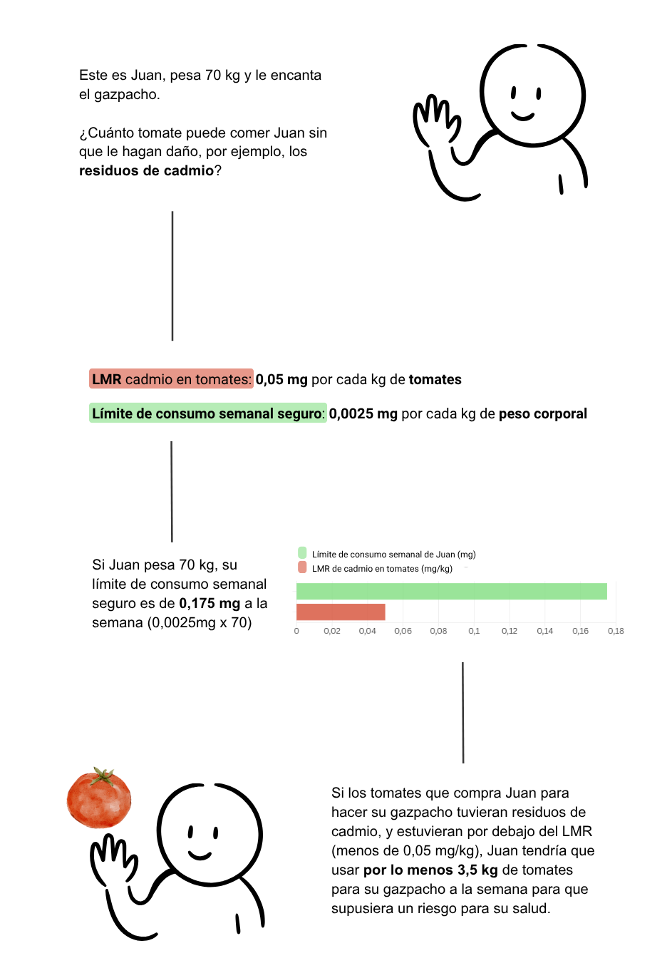 El cadmio es un metal pesado carcinogénico para humanos, según la lista de la Agencia Internacional de Investigación sobre el Cáncer (IARC, por sus siglas en inglés) y es tóxico para la salud, con la disfunción renal como principal efecto. La EFSA establece un límite de consumo semanal seguro de 0,0025 mg por cada kilo de peso corporal, esto significa que un adulto de 70 kg podría consumir semanalmente 0,175 mg de cadmio. El LMR de cadmio, en tomates por ejemplo, es de 0,05 mg/kg. Esto significa que un adulto tendría que comer unos 3,5 kilos de tomates a la semana (respetando los LMR), cada semana de su vida, solo para alcanzar el límite establecido. A no ser que seas un fanático del gazpacho, no habría de qué preocuparse.