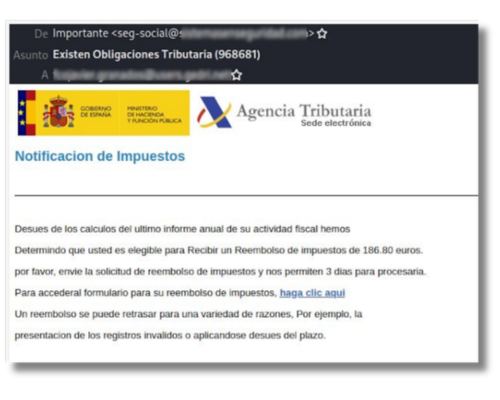 Email spoofing: correos que aparentan enviarse desde el dominio oficial de la Agencia Tributaria