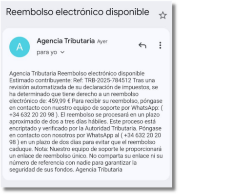 En otro ejemplo, el correo pedía ponerse en contacto con un número de teléfono por WhatsApp para solicitar un supuesto reembolso, pero la AEAT nunca pide contactar por este canal de mensajería.
