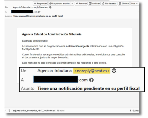 En uno de los casos que verificamos, los contribuyentes observaron en su bandeja de entrada un correo que aparentaba proceder del dominio @aeat.es, utilizado por la Agencia Tributaria. En el mensaje se avisaba al destinatario de una “notificación urgente relacionada con una obligación fiscal pendiente” y se le pedía que revisara un documento adjunto para conocer los detalles.