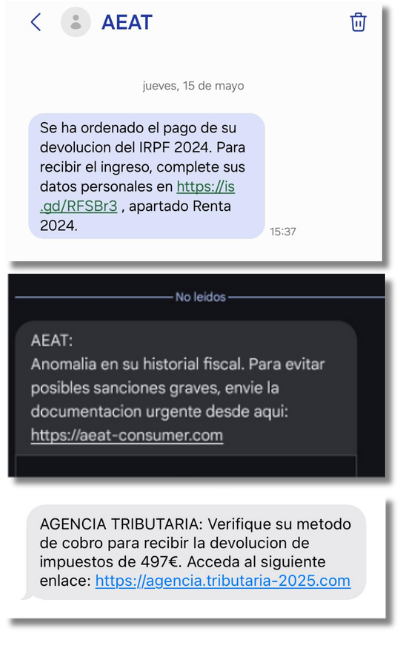 Estos mensajes suelen hacer referencia a operaciones que requieren una acción inmediata por parte del destinatario, como devoluciones del IRPF, problemas en el historial fiscal o que piden verificar la información de pago.