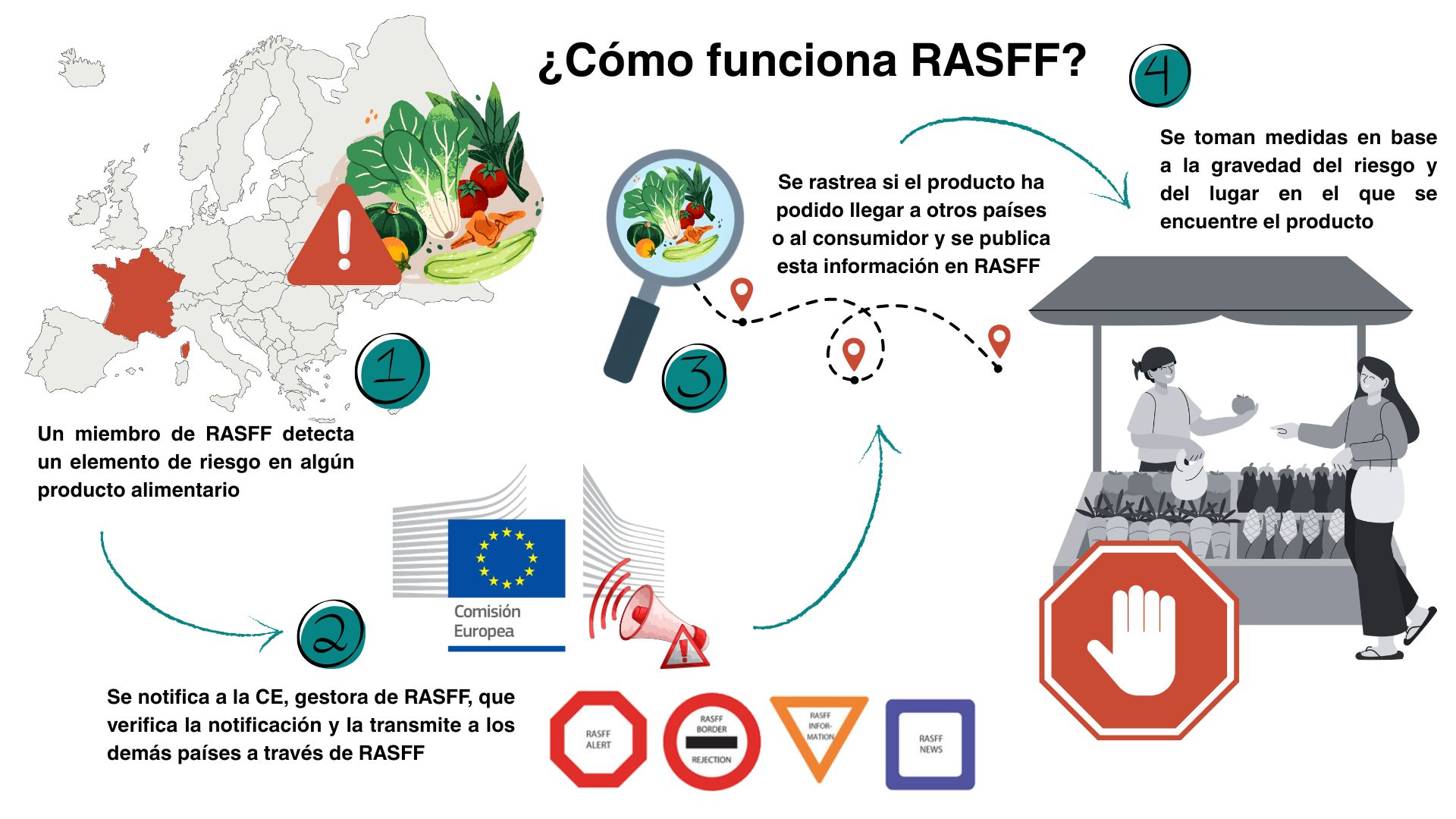 Cuando un miembro de RASFF (que son los 27 países de la UE, junto con Noruega, Liechtenstein e Islandia, además de la CE y la Autoridad Europea de Seguridad Alimentaria) detecta un elemento de riesgo en un alimento, como microorganismos patógenos o restos de pesticidas superiores a los límites permitidos, rellena una plantilla estandarizada (datos del producto, los peligros detectados y su trazabilidad) y avisa a la Comisión Europea. Esta actúa como gestora: verifica la alerta y la difunde de inmediato al resto de países.