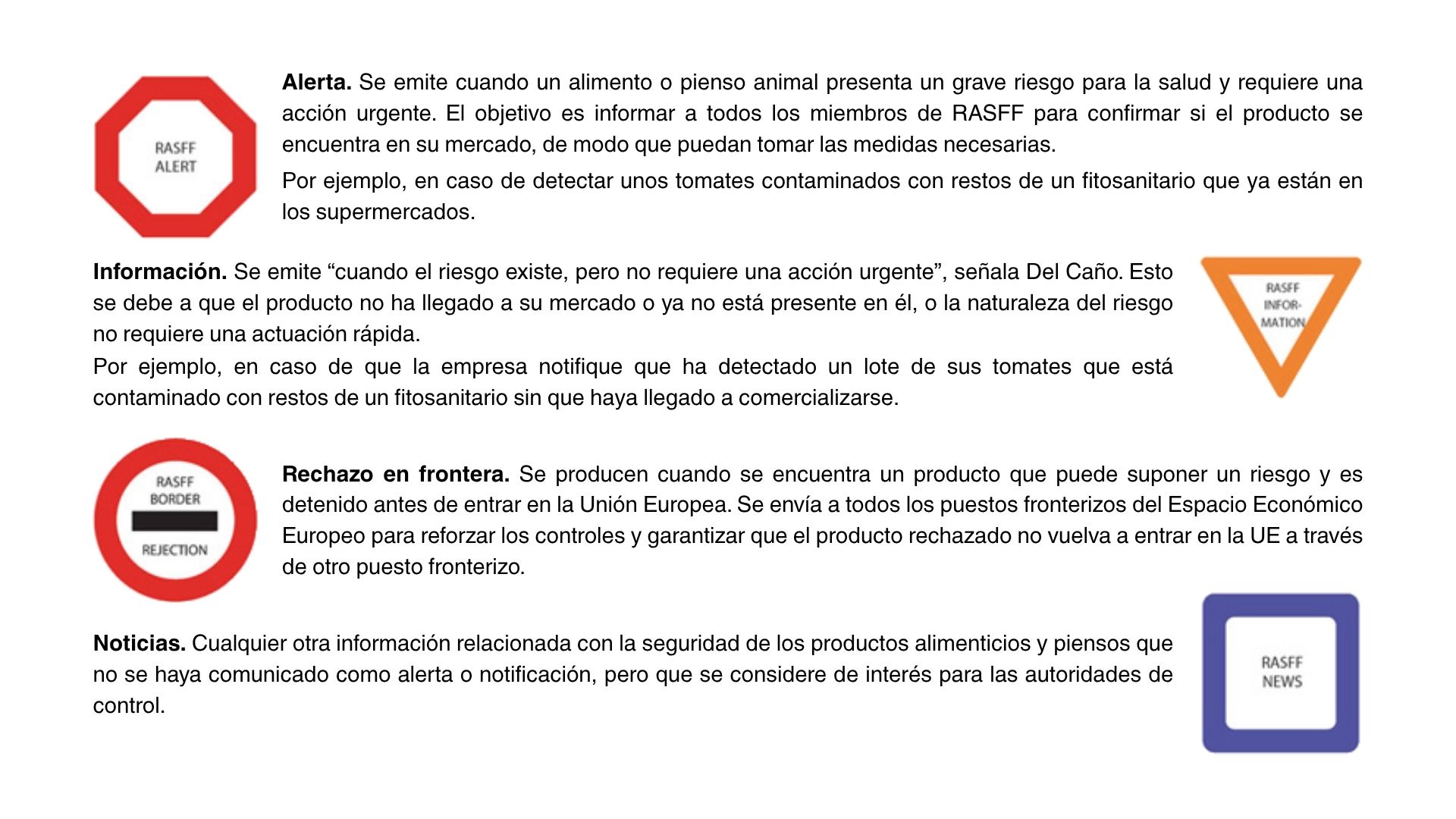 Desde 2024 se ha consolidado el uso de RASFF como herramienta europea para emitir notificaciones dirigidas a las autoridades competentes (no al consumidor) sobre productos alimentarios que pueden suponer un riesgo para la salud. Se trata de una red de comunicación de los países de la Unión Europea para avisarse entre sí de cualquier irregularidad relacionada con productos alimentarios que se estén comercializando en el mercado europeo o que hayan intentado entrar en él. Este sistema permite “tomar medidas coordinadas, coherentes y simultáneas” para garantizar el máximo nivel de protección del consumidor, según explica la Comisión a Maldita.es. Esto va en línea con uno de los objetivos de la Política Agraria Común para proteger la calidad de los alimentos y de la salud. Además, en España, en los casos en los que un producto sobre el que se emite una alerta ha llegado al mercado, la AESAN, las comunidades autónomas o las empresas notifican a la población para evitar que sea consumido.