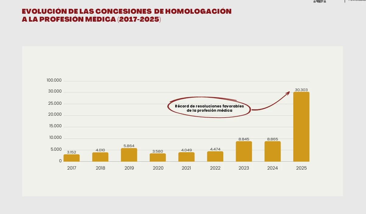 No. La regularización extraordinaria entró en vigor el 16 de abril, mientras que la cifra de 30.303 títulos de Medicina homologados corresponde con el año 2025, según el último informe de homologaciones presentado por el Ministerio de Ciencia, Innovación y Universidades. Esta cantidad supone casi el 80% del total de homologaciones que se realizaron ese año y supera, con mucha diferencia, a los convalidados en años anteriores.
