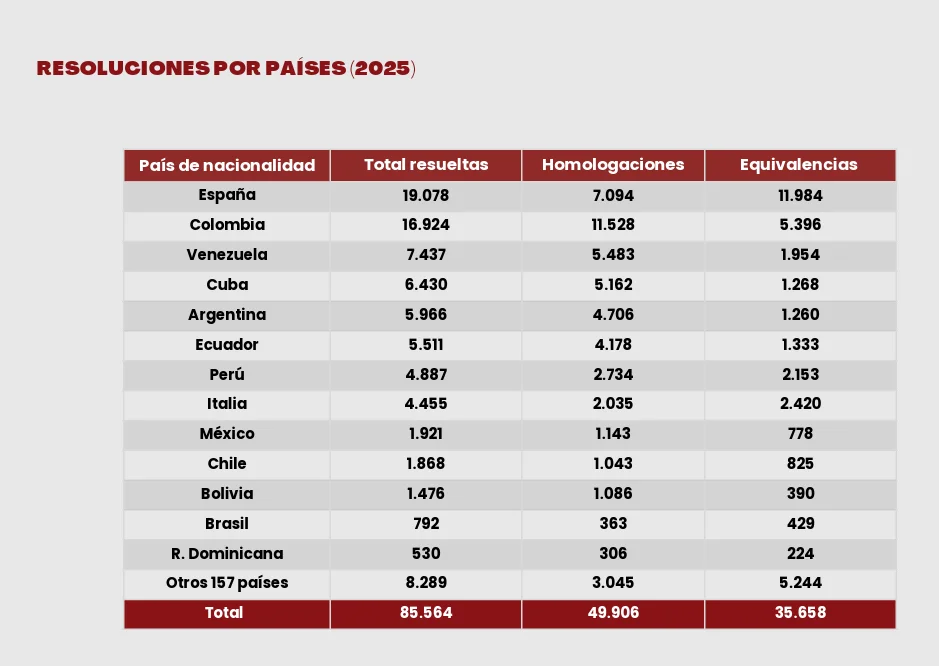 En cuanto a la procedencia de los expedientes resueltos, después de los españoles con títulos obtenidos en el extranjero, las personas de Colombia, Venezuela y Cuba son las que más homologaciones obtuvieron en 2025.